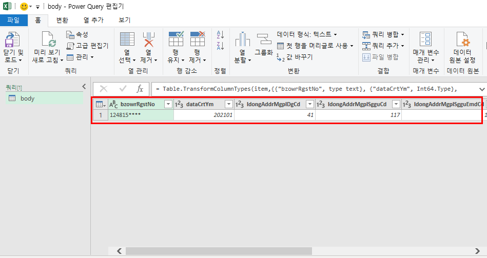| bzowrRgstNo | 사업자등록번호 | 10 | 1 | 124815**** | 사업자등록번호(앞에서 6자리) |