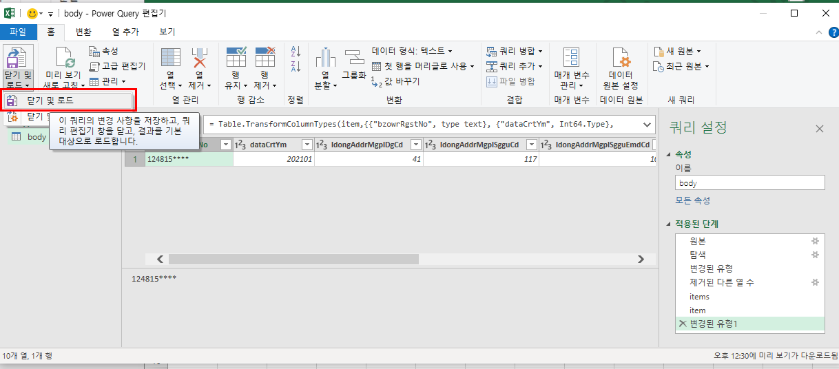 닫기 및 로드를 클릭해 응답값을 엑셀로 불러오자.