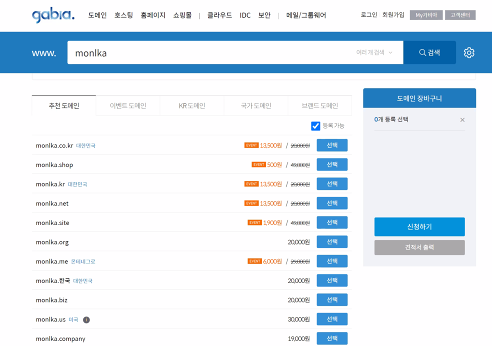 가비아에서 구매하고 싶은 도메인 주소를 검색하여 구매하면 된다. 쉬운 도메인은 서비스가 충분히 커진 뒤에 잡아도 된다.
