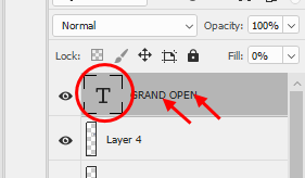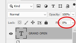 1. 텍스트 레이어를 클릭하고, 칠(영문판: Fill)의 숫자값을 0%로 맞춰준다.